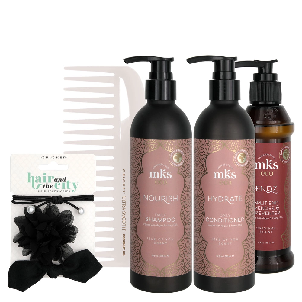 Follow your MKS Eco Nourish Daily Shampoo with the MKS Eco Hydrate Daily Conditioner, a rich conditioner infused with Hemp and Argan Oils. Those two rich oils lock in moisture so hair remains well-hydrated, soft, and smooth. While Panthenol deeply nourishes and conditions the hair, adding manageability, and wheat protein strengthens and protects the hair. Like the shampoos, these conditioners are available in five exotic scents, and the Light Breeze scent is formulated for those with fine hair. After using these shampoos and conditioners, the hair is strengthened, more manageable, moisturized, silky smooth, and bursts with shine.