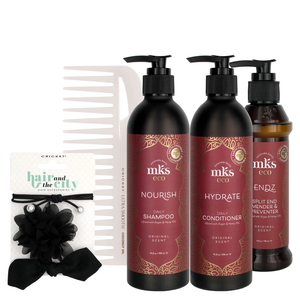 Next, perfect your hair with the MKS Eco Endz Split End Mender & Preventer. Formulated with a powerful blend of Argan Oil and Hemp Seed Oil that is nutrient-rich and ultra-fortifying. Hydrolyzed Wheat Protein strengthens the cuticle of each hair strand and protects it from future damage, while Vitamin E deeply nourishes the hair and locks in moisture, improving the hair’s manageability and boosting shine. The MKS Eco Endz Split End Mender & Preventer leaves hair healthier and more hydrated and lessens the appearance of split ends.