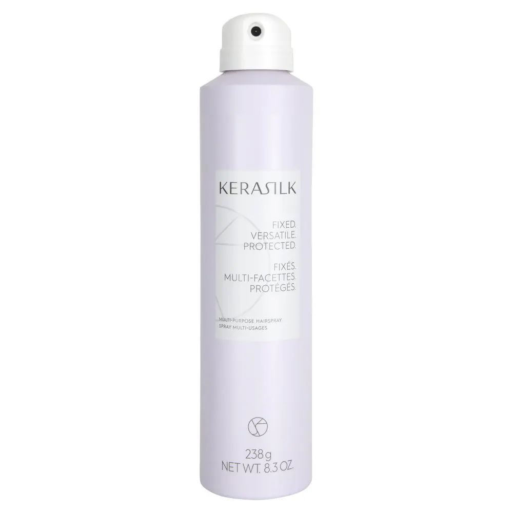 The Kerasilk Multi-Purpose Hairspray is formulated without silicones, sulfates, mineral oil, or microplastics, and has a vegan formula. Ideal for all hair types and textures.