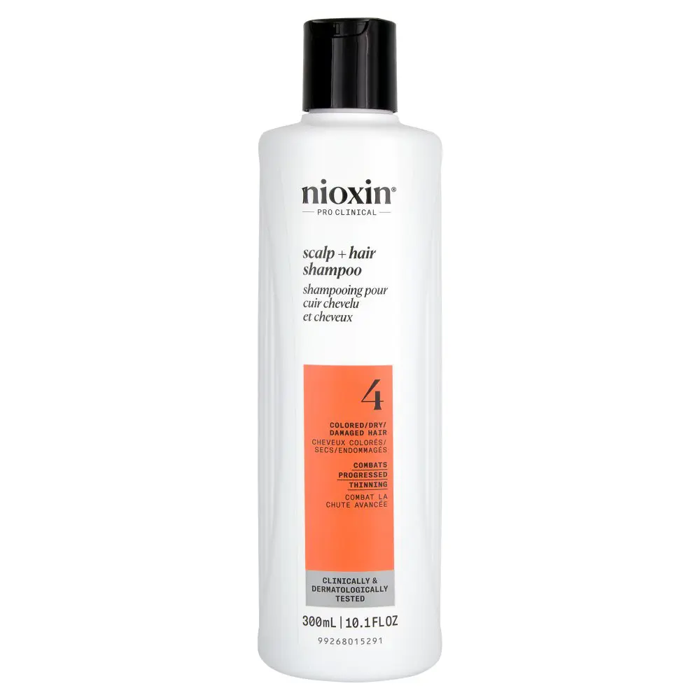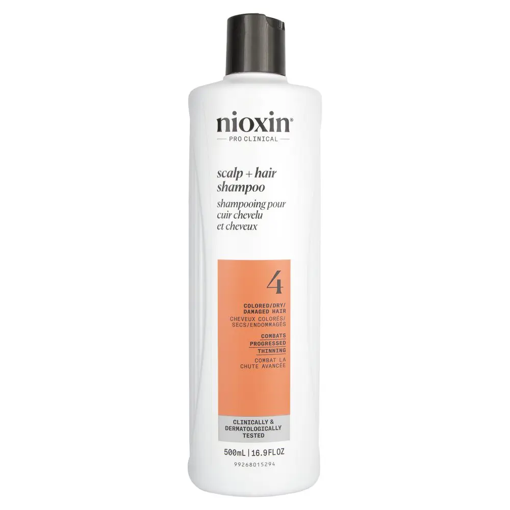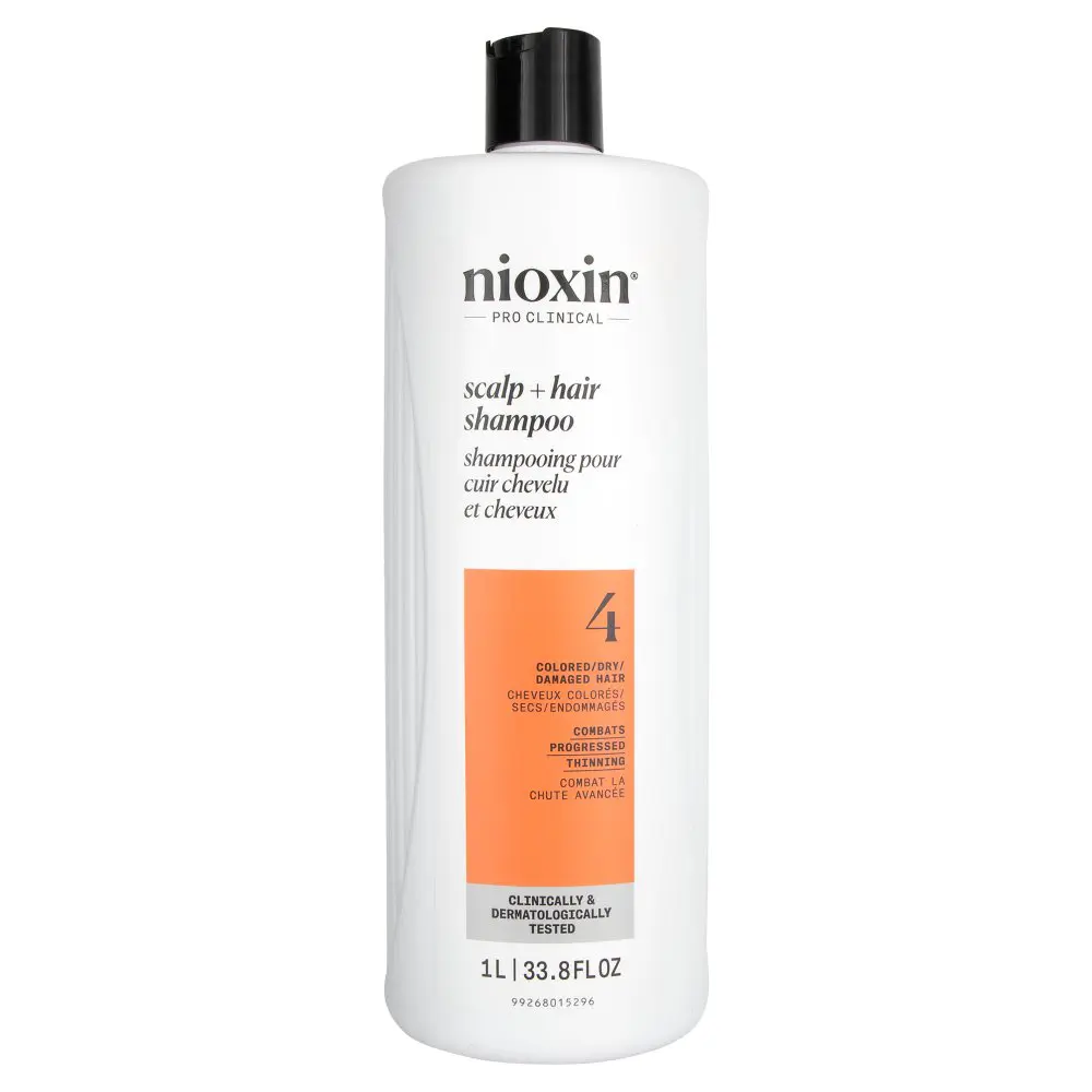 System 4 is specially designed for noticeably thinning, fine, chemically-treated hair. It delivers denser-looking hair while protecting the scalp and providing moisture balance to colored hair. System 4 Cleanser helps to remove follicle-clogging sebum, fatty acids, and environmental residues from the scalp skin, and hair. Cleanses to provide thicker-looking hair. The NIOXIN System 4 Cleanser Shampoo is formulated with Pro-Color Shield technology that helps remove sebum, fatty acids, and other environmental residue from the scalp and hair.
