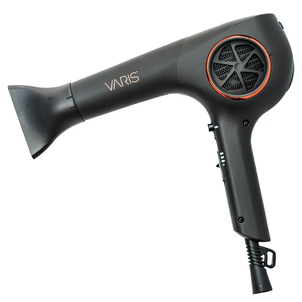 NEW! Weighing less than 1 lb, the Varis Dryer is a full-size, 1800-watt, professional salon dryer that has a 14-foot cord! Its Eco Turbine Motor with patented brushless technology dries hair 50% faster and is 20% quieter with Zero Emissions! The barrel is infused with Hydroionic Crystals that help to hydrate and condition the hair while you create beautiful and sleek styles. It features three different speed settings and a unique cool shot button that when it is activated is pressed outward, so you can keep continuous cool air flowing for as long as you need it. This feature helps to smooth the hair and close down the cuticle creating effortlessly sleek styles. The side vents remove easy for quick and easy cleaning and allow your dryer to function on its highest level at all times. The VARIS Hair Dryer comes with a concentrator nozzle attachment for precise blowdrying and added hair smoothness.